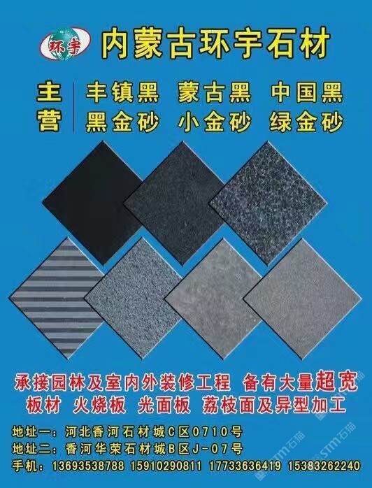 內(nèi)蒙古環(huán)宇石材,專(zhuān)營(yíng)各種黑色花崗巖。光面、火燒面、自然面、荔枝面、剁斧面。各種異形加工。工程以及家裝均可