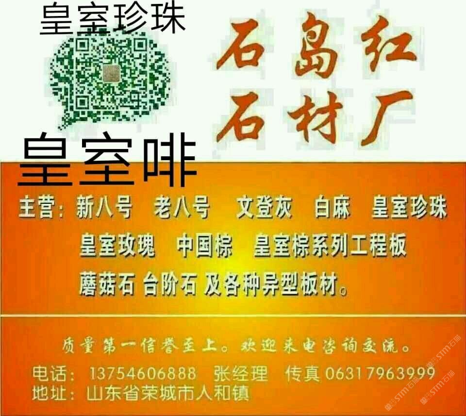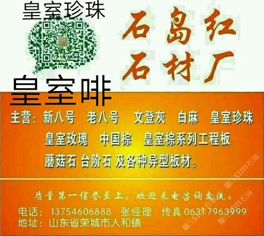 該企業(yè)尚未填寫簡介,請補(bǔ)充!山東石島紅石材廠主營 新八號 老八號 文登灰 白麻 皇室珍珠 皇室玫瑰 中國棕 皇室宗系列工程板 蘑菇石 臺階石 及各種異型板材。質(zhì)量信譽(yù)至上。歡迎來電咨詢交流。電話 13754606888 張經(jīng)理 傳真 0631 7963999。 qq 245382641