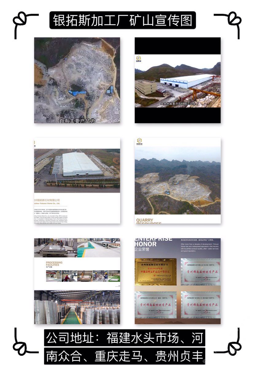 貴州銀拓斯石材有限公司成立于2012年9月,位于黔西南州貞豐縣北盤江鎮(zhèn),經(jīng)營范圍為石材開采、加工、銷售,主要加工貴州木紋、米黃等系列產(chǎn)品。貴州銀拓斯石材有限公司占地面積65.74畝。引進國內(nèi)外先進的石材生產(chǎn)工藝和加工設(shè)備,現(xiàn)已安裝科達靜壓鋸6臺、高效磨機1臺等設(shè)備,年產(chǎn)板材100萬平方米。公司自有木紋礦山兩處、米黃礦山兩處、新品礦山兩處,年產(chǎn)荒料5萬立方米。公司秉承“勵志創(chuàng)新、篤守誠信”的經(jīng)營理念,立足于重實際、辦實事、見實效,把文化理念融入到生產(chǎn)建設(shè)和質(zhì)量管理的各個環(huán)節(jié),致力于用文化提升領(lǐng)導(dǎo)力、執(zhí)行力和凝聚力,以文化促進生產(chǎn)力,以軟實力提升“銀拓斯”整體發(fā)展水平,為客戶提供“高效率、高品質(zhì)、全方位”的服務(wù),不斷提升產(chǎn)品品質(zhì),程度地滿足客戶的需求。\\\\\\\
