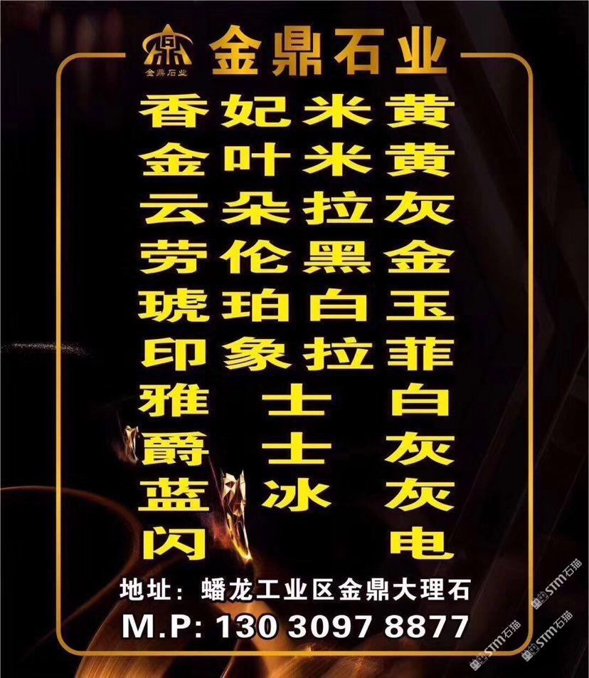 金鼎石業(yè)主營(yíng):香妃米黃,金葉,奧特曼,雅士白,云朵拉灰,白玉蘭,閃電灰,奢石,魚(yú)肚灰,波斯灰