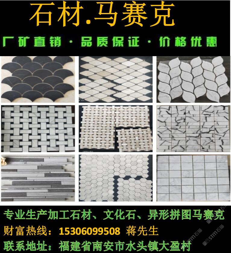 廈門(mén)摩恩石材馬賽克工廠是生產(chǎn)馬賽克、大理石、拼花、石線等石材的專(zhuān)業(yè)工廠,工廠成立15年誠(chéng)信合作,價(jià)格公道,以質(zhì)量求生存,歡迎來(lái)廠參觀、詢(xún)價(jià)、考察下單。我們的工廠負(fù)責(zé)人蔣先生隨時(shí)恭候您的光臨,電話:15306099508,微信:15306099508 qq:1043118173