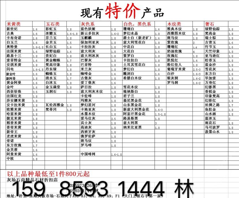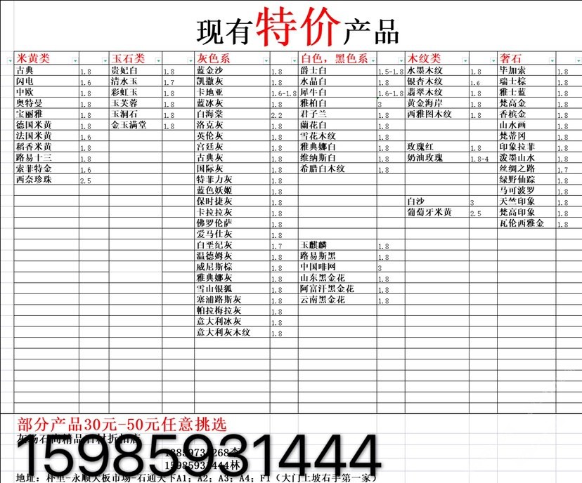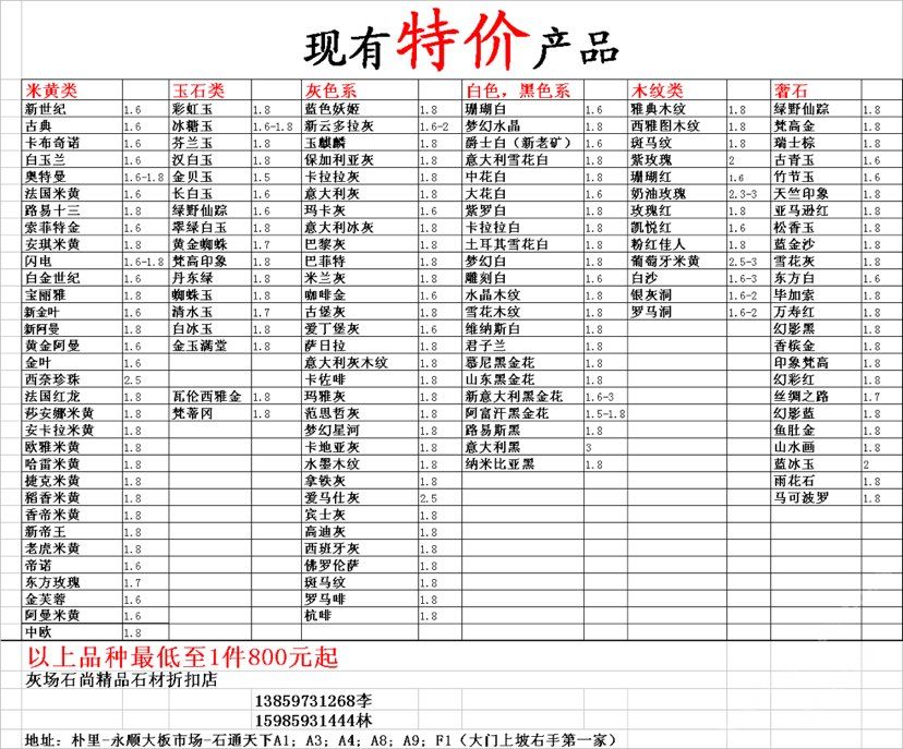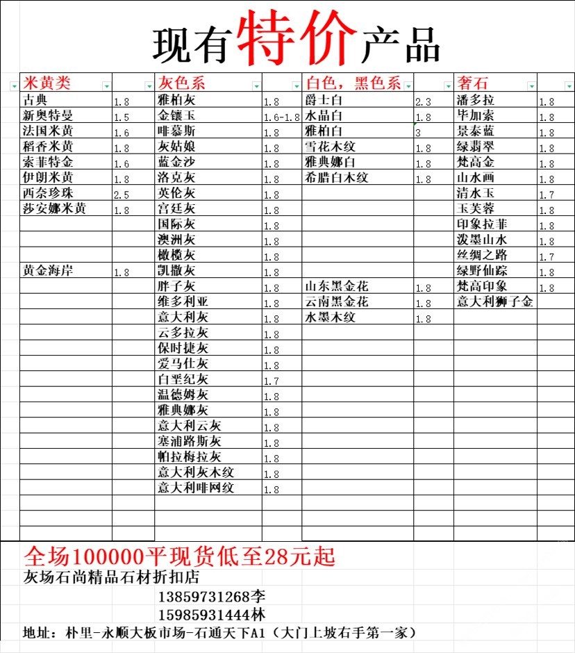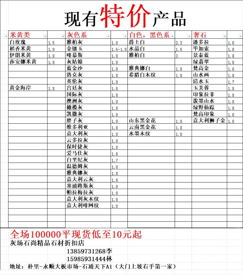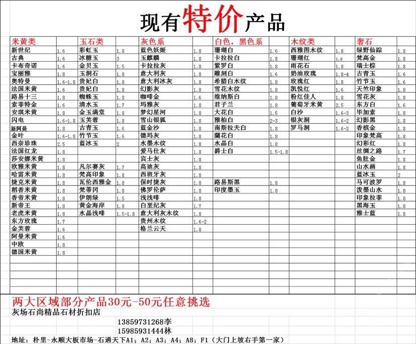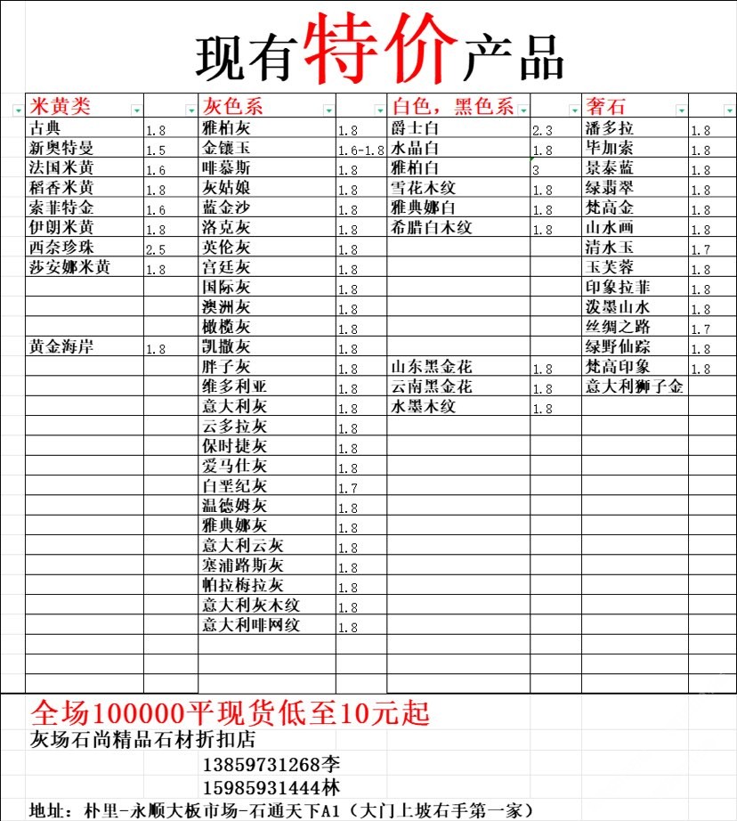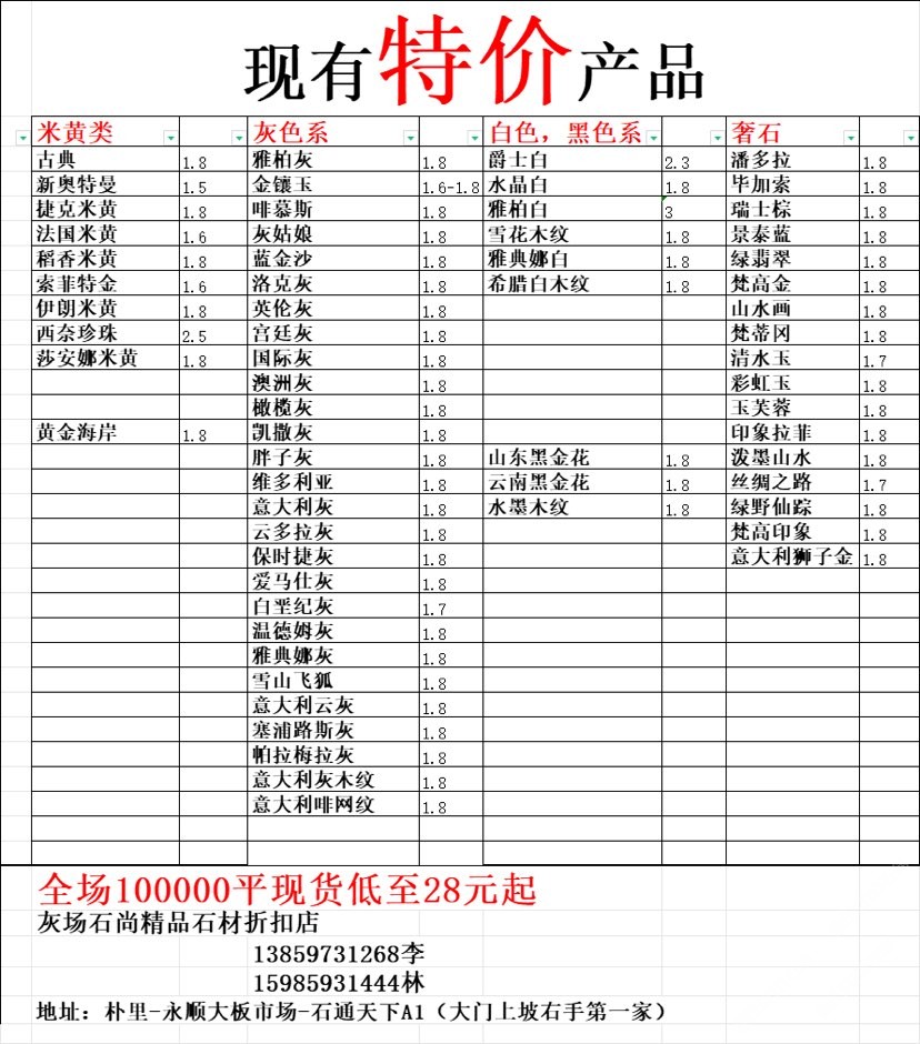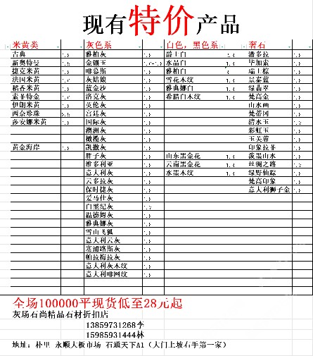 現有100000平大板特價(百來個品種),低至30元起