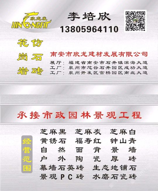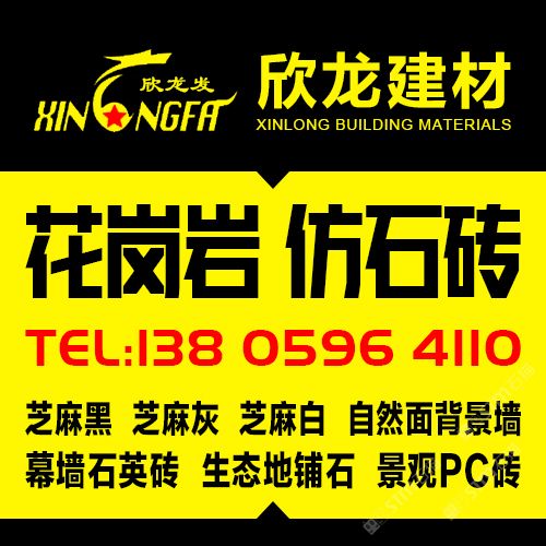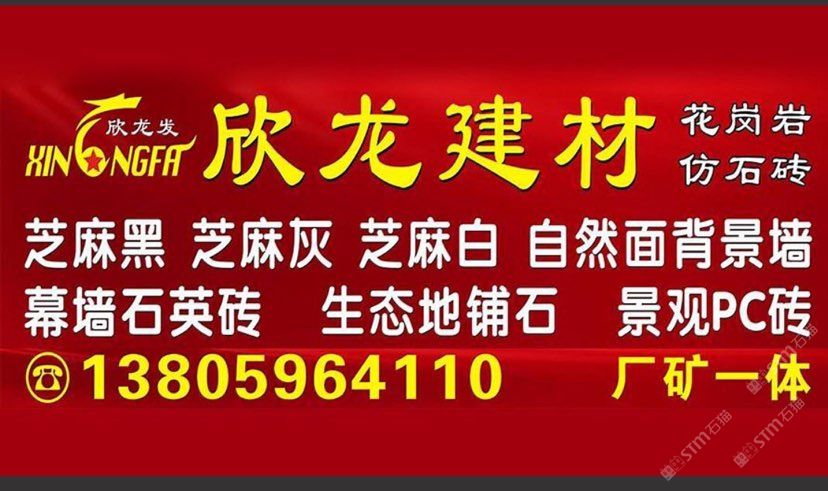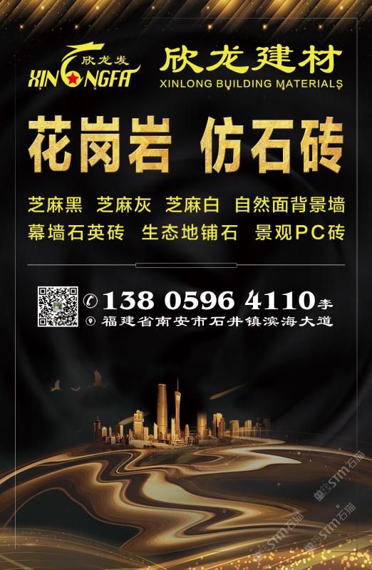 南安市欣龍建材發(fā)展有限公司,位于建材之鄉(xiāng)—福建省南安市石井鎮(zhèn),公司旗下?lián)碛袃纱笾髁Ξa(chǎn)品:花崗巖?仿石磚。(一)花崗巖:廠礦一體,荒料?大板?成品精加工,一站式供應(yīng)。擁有芝麻黑、芝麻灰、芝麻白、銹石、蝦紅、小藍寶、藍寶石、泉州紅、永定紅、福壽紅、福建青、鐘山青、喬治亞灰、G606、G617等品種,承接幕墻干掛、園林景觀、市政廣場、機場高鐵、別墅豪裝、酒店精裝、異形雕刻、自然面背景墻等工程。為石而生,匯聚石尚生活! (二)仿石磚:戶外陶瓷厚磚,接受客戶需求定制。不是石材,更勝石材!抗壓強度高、抗凍性能好、防滑耐磨、綠色環(huán)保。擁有幕墻石英磚、生態(tài)地鋪石、景觀PC磚、環(huán)保熔巖板、陶瓷透水磚、水泥PC磚等系列產(chǎn)品。采用先進的技術(shù)與工藝,融匯東西方精粹,不斷創(chuàng)新,將不同文化風尚及搭配方式重新組合設(shè)計,開發(fā)現(xiàn)代新穎的產(chǎn)品,造就逼真無瑕的自然外觀質(zhì)感,滿足全球客戶不斷發(fā)展的個性化需求。產(chǎn)品廣泛應(yīng)用于園林小區(qū)、商業(yè)地產(chǎn)、公園廣場、市政道路、高鐵地鐵、酒店賓館、居家庭院、步行街、寫字樓、度假村、機場、學校、醫(yī)院、綠道等干掛鋪裝場所。因為專注,所以專業(yè)!