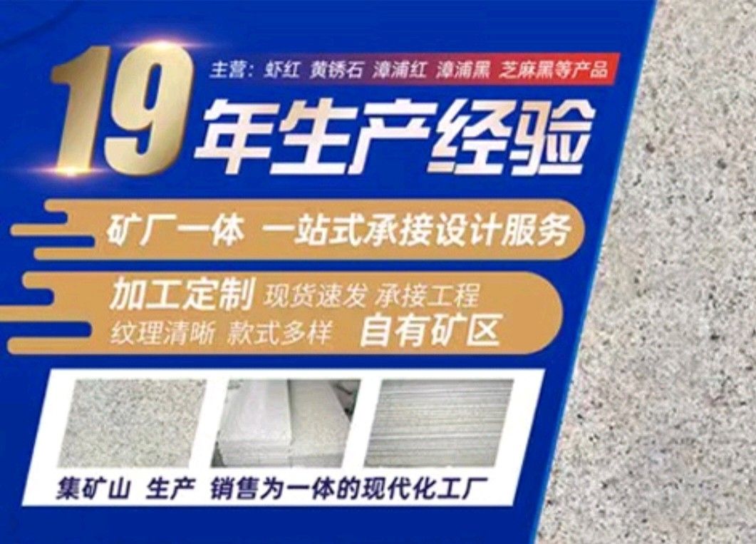 漳浦縣鴻勝石材有限公司是一家集礦山開采、自營加工生產(chǎn)、自主產(chǎn)供銷為一體的石業(yè)公司,公司擁有數(shù)家生產(chǎn)基地、手工加工場、大型礦山。公司創(chuàng)業(yè)歷程10年,憑著豐富的加工生產(chǎn)經(jīng)驗、雄厚的技術(shù)力量和先進(jìn)的設(shè)備,產(chǎn)品遠(yuǎn)銷歐美、韓國、新加坡、臺灣等地,深受客戶的信賴與好評。 本公司產(chǎn)品主要有: 漳浦紅,漳浦黑,漳浦青,漳浦蝦紅,漳浦銹石,福建青,安山巖,芝麻黑,芝麻灰,沙漠棕等。