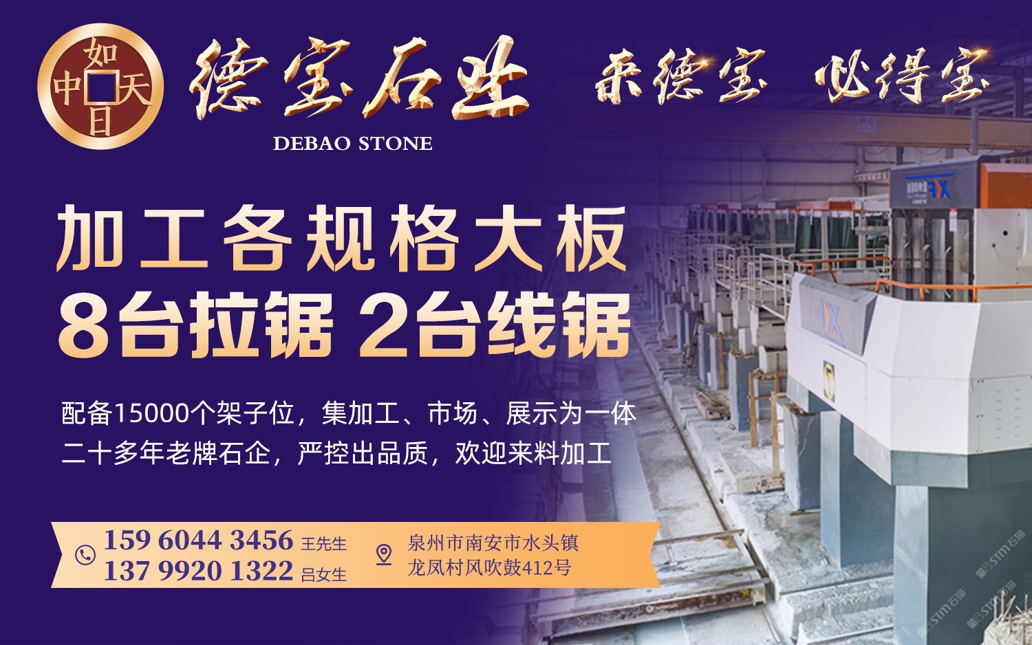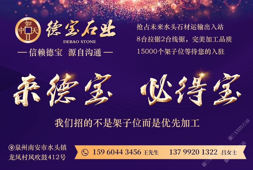 德寶大理石專業(yè)加工各規(guī)格大板,8臺拉鋸2臺線鋸,配備15000個(gè)架子位,是一家集加工、市場、展示為一體的二十多年老牌石企,嚴(yán)控出品質(zhì),歡迎來料加工!