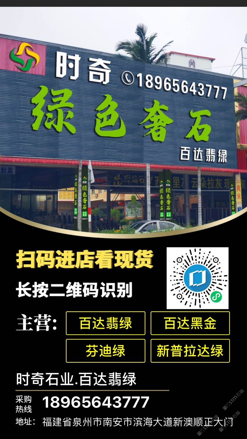 時奇石業(yè)綠色奢石專場 聯(lián)系人:方小姐    189****3777 查看 189****3777 查看 主營范圍: 大板批發(fā)、荒料、大理石加工、異型加工、礦山、 企業(yè)地址:福建泉州南安市水頭鎮(zhèn)濱海大道南升石材城6號門C23