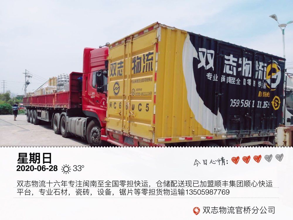 發(fā)布信息: 水頭雙志物流十六年專注閩南至全國零擔快運,現(xiàn)已加盟順豐集團順心快運平臺,專業(yè)石材、瓷磚、設備、鋸片等零擔貨物運輸。本物流專線福建到全國各地線路零擔整車 運輸業(yè)務,零擔隨時上門提貨,天天發(fā)車,價格合理!專注全國石材瓷磚配件零擔直達快運及閩南地區(qū)同城零擔配送一日達,順豐集團順心平臺各種零擔貨物10公斤起收,電商平臺入倉,大件送貨上樓,全國無盲區(qū),十六年專業(yè)值得您的托付!公司秉承客戶至上,服務的理念! 歡迎各位新老朋友來電洽談! 手機微信同號:13505987769/15905908260李(女士)