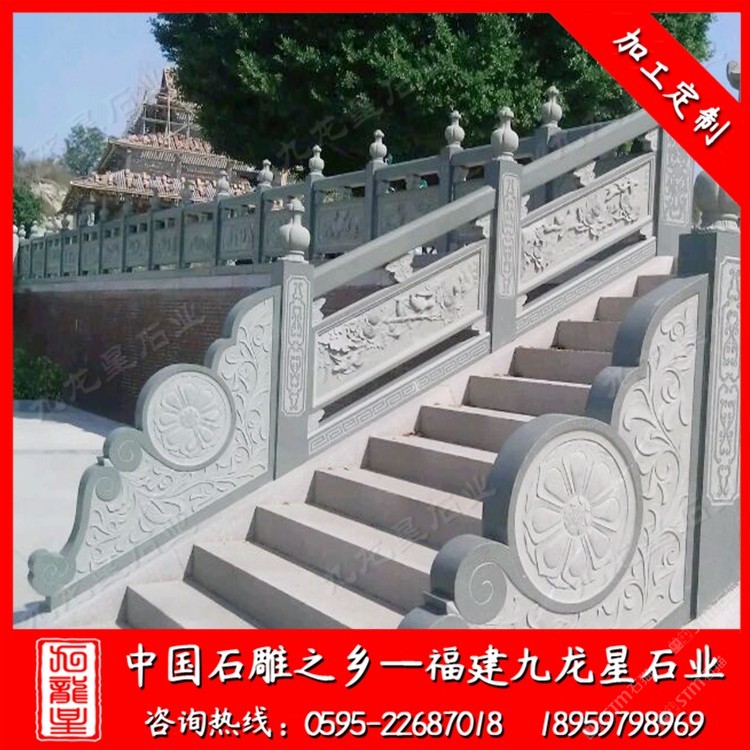 發(fā)布信息: 九龍星石業(yè)常年批發(fā)石材欄桿護欄,寺廟欄桿、別墅欄桿、景區(qū)石雕護欄、河道池塘欄桿護欄、公路石雕護欄等等。歡迎咨詢我們,我們會發(fā)您一些適合您的石材欄桿護欄圖片,并為您做出報價(18959798969微信同號)。 石材欄桿護欄使用天然石材雕刻制作,使用壽命長,可塑性非常強,可以制作成方形、圓形、橢圓形等各種樣式,并可在上面雕刻各式圖案。 石材欄桿護欄起到防護安全,在建筑物氣勢方面起著重要的作用。石欄桿應用廣泛,適用于道路、橋梁、河道、堤壩,寺廟等。石雕欄桿主要以花崗巖石材和青石石材較常見。