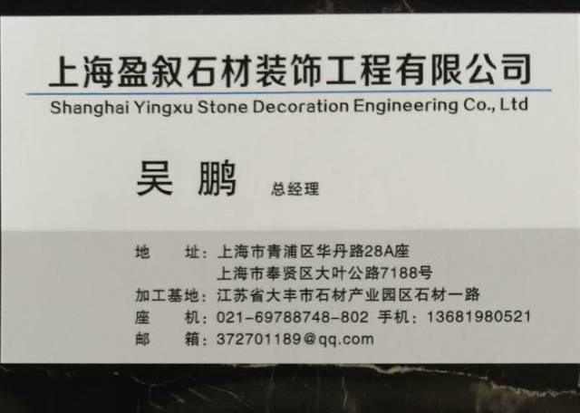 上海盈敘石材裝飾有限公司 聯(lián)系人:吳鵬    136****0521 查看 手機(jī)號(hào)碼:無(wú) 主營(yíng)范圍: 石材工程資質(zhì)企業(yè)、大理石加工、荒料、大板批發(fā)、水刀拼花、 企業(yè)地址:上海青浦區(qū)華新鎮(zhèn)華丹路28A座