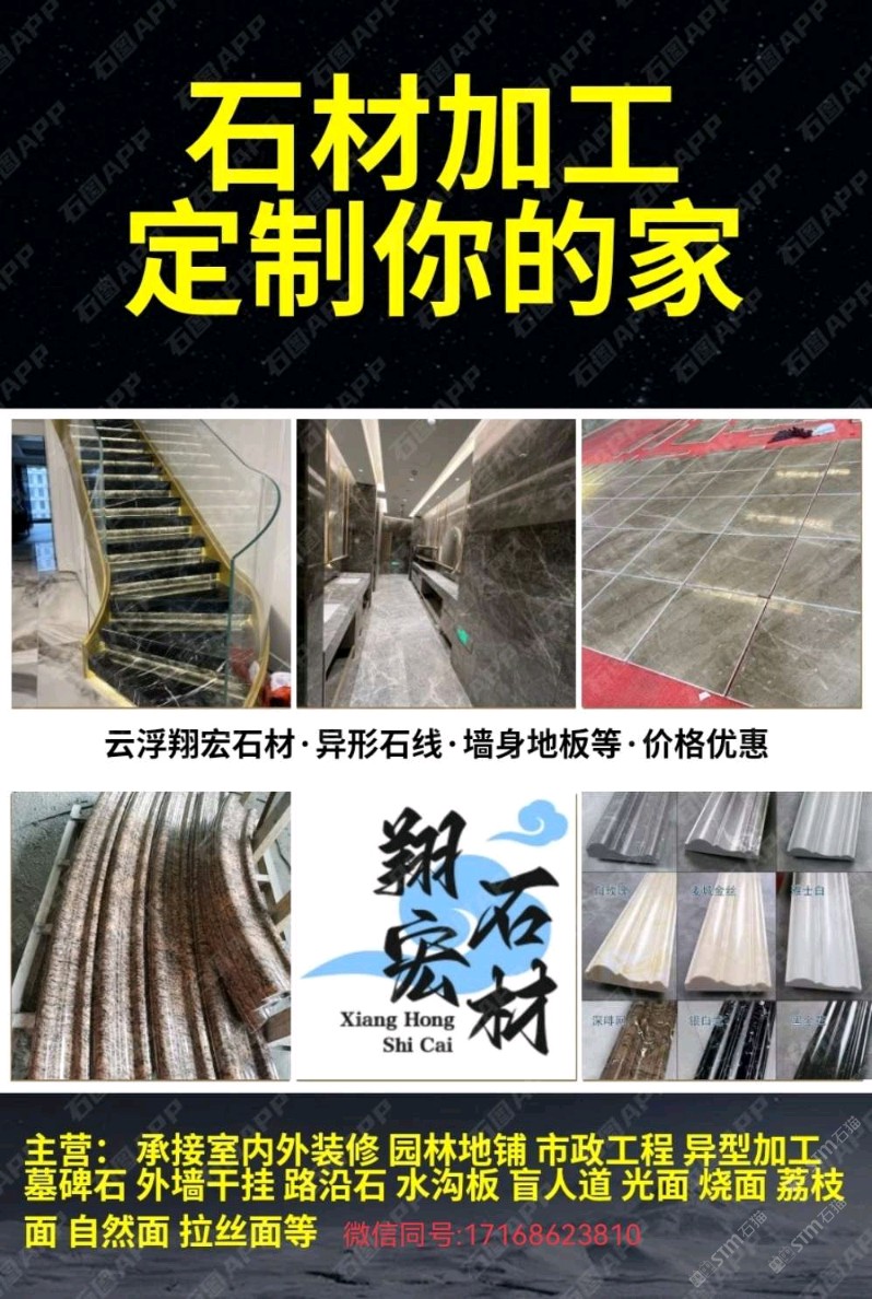 發(fā)布信息: 翔宏石材加工部,切割開料、專業(yè)對外加工、磨邊機對外加工、背景墻水溝蓋板、異型石線、線條、樓梯、室內外墻體、洗手臺、盲人石/導盲石、地鋪石等
