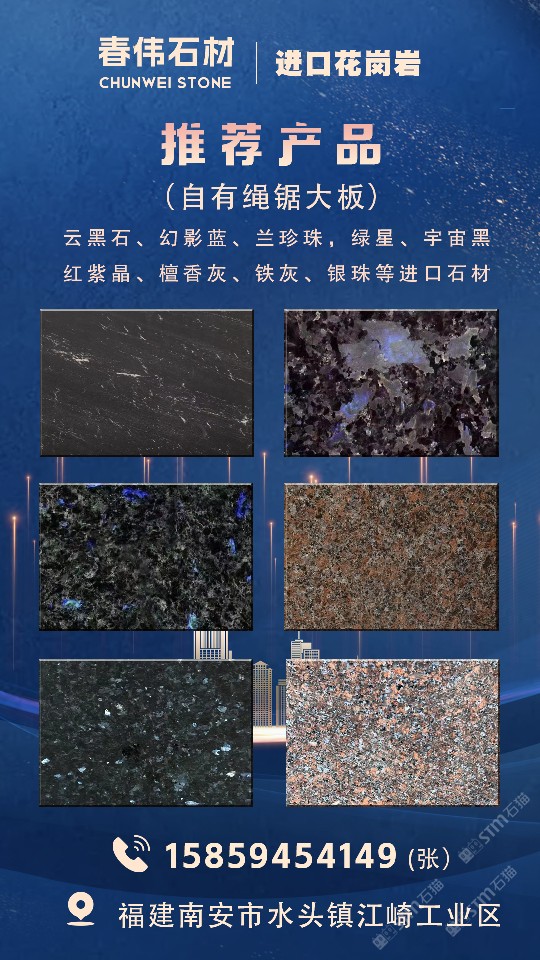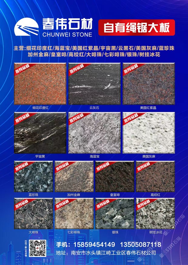 春偉石業(yè):鐵灰/銀珠/蘭珍珠/綠星自有繩鋸大板