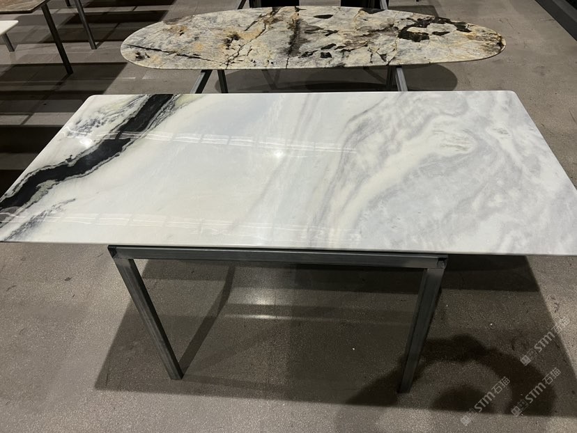 熊貓白奢石餐桌 天然水墨