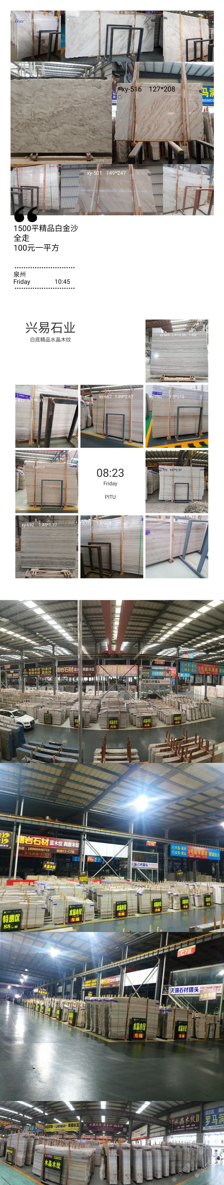 發(fā)布信息: ? ? ? 【興易大理石】 ? ? 白底水晶木紋專場 ? 我司主營水晶木紋系列: 水晶木紋,翡翠木紋,國產(chǎn)藍(lán)金沙,白金沙,彩虹木紋 ? 2萬平精品白底水晶木紋新料任選, 條板,大板 荒料均有售,統(tǒng)一花色,防水背膠供應(yīng)! 500平藍(lán)底水晶木紋全走價(jià)優(yōu) 1300平斜紋白金沙全走價(jià)優(yōu) 歡迎新老客戶來電垂詢! ? ?地址: ? 濱海高時(shí)物流一號(hào)館大門旁 ? 創(chuàng)安c區(qū)c7區(qū)興易石材 ? 電話:13514000031小李 ? ?