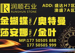 潤順石業(yè)主營產(chǎn)品:奧特曼(旺程礦),莎安娜(老礦),莎安娜米黃,莎安娜米黃(白沙糖底),奧特曼,現(xiàn)代灰,愛瑪仕灰,雅士白企業(yè)地址:福建泉州南安市荷北路澳盛市場10棟2區(qū);盛達(dá)市場h7區(qū)
